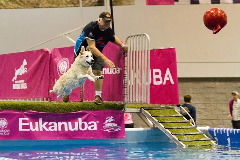 Dock Diving is a fun, exciting but easy to do sport with simple rules: You throw your dog’s favorite toy into a pool while he waits on a dock about 40 feet long. On your command, he runs along the dock, flings himself off the end of it, lands in the water and grabs his toy. The goal is to have the longest jump possible, which could be as short as two feet for beginners, or as much as 30 feet for those more experienced!